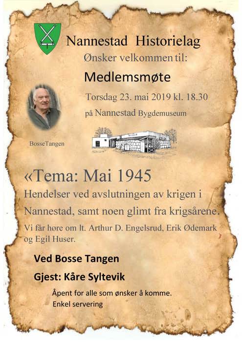Temaet var Mai 1945 - hendelser ved avslutningen av krigen i Nannestad, samt noen glimt fra krigsårene.
